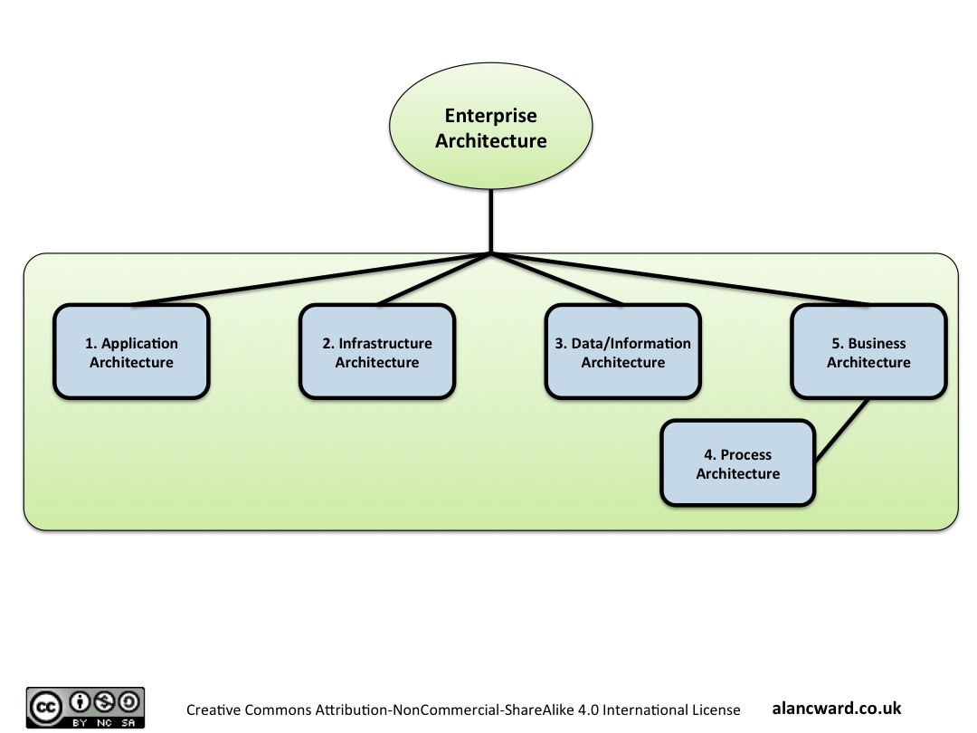 A typical Enterprise Architecture structure would include Application Architecture, Infrastructure Architecture, Data/Information Architecture and Business Architecture. Usually implemented in that order when originating from an IT perspective. In fact, I’ve often seen the sub-architecture of Process Architecture being implemented before Business Architecture.