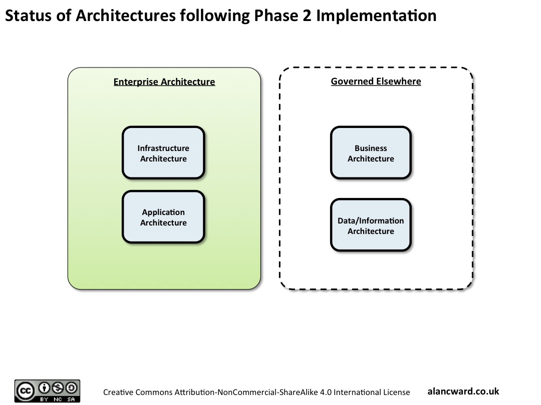 In addition, if we take the EA implementation diagram mentioned earlier, we can see that there are several transition states; one after each phase where only a subset of the Enterprise Architecture has been implemented. The typical transition state follows phase 2, where we see EA comprising Infrastructure and Application Architectures, all governed through an EA route. But with Business Architecture and Data/Information Architecture governed through other routes.