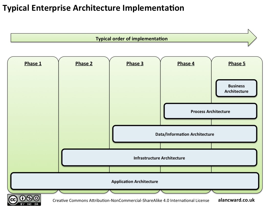 This is opposite to what we would expect if we were able to plan it logically. In that case, we’d apply Business Architecture first in order to understand the aims and vision of the organisation, then organise everything around that vision. That’s where the other architecture domains come in. That’s the method as described (but often not followed) within TOGAF ADM. Start with the agreements, architectural principles, then business architecture to define the requirements for the other architecture domains.