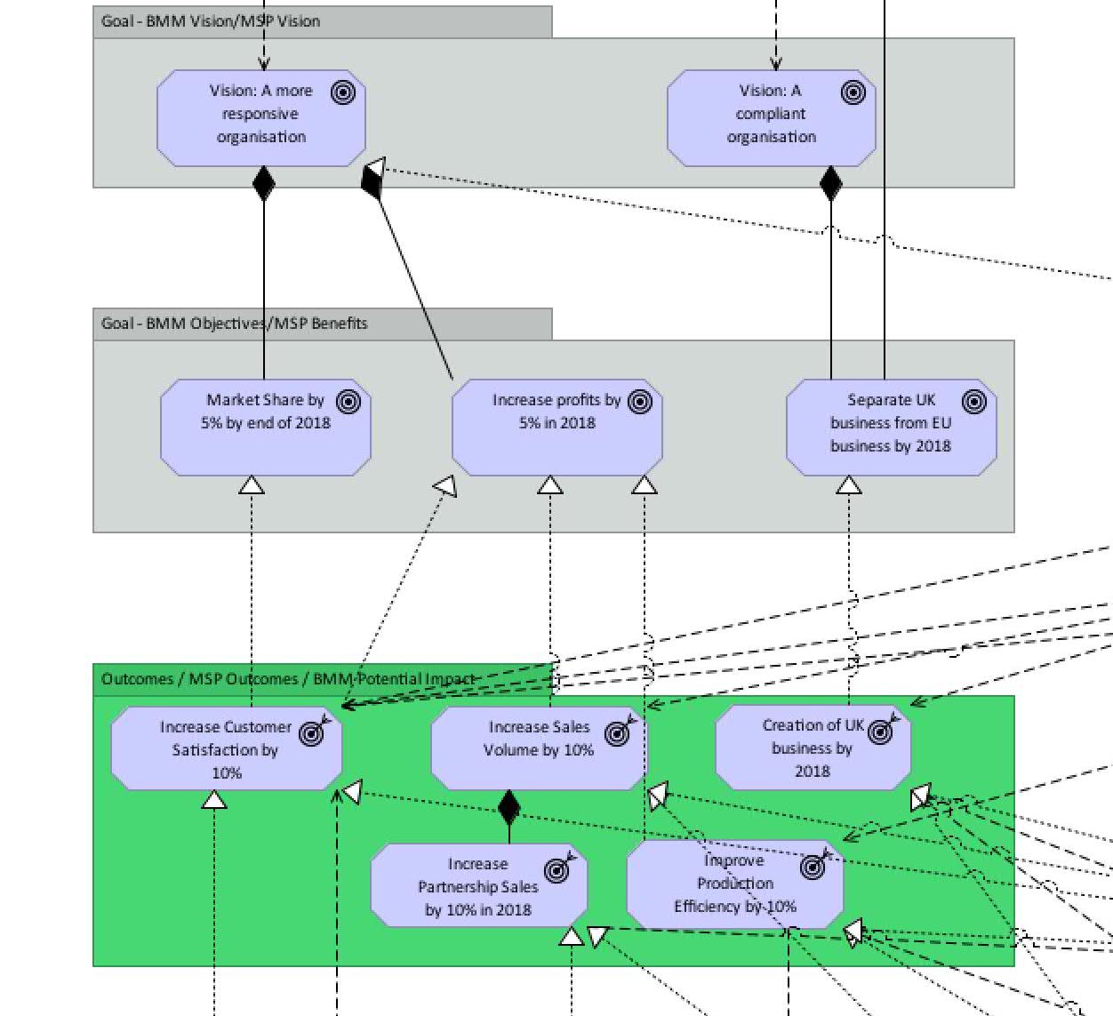 While drivers and goals can be mapped, the main issue has been that the Business Motivation Model is an organisation-wide concept, very top down (at least initially), whereas programmes usually start one or two levels down from the executive board.