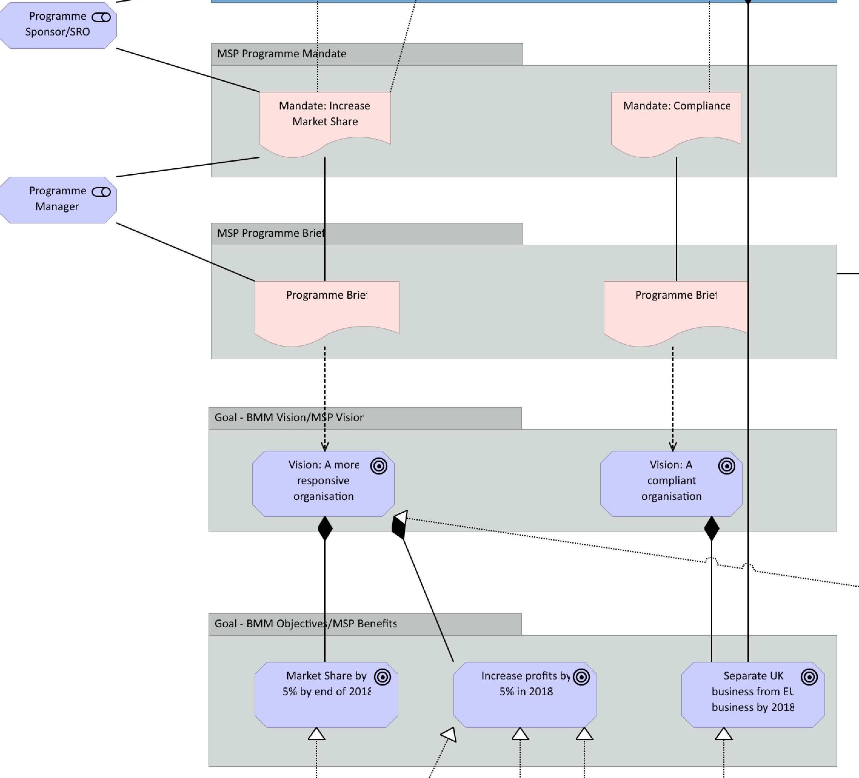 For the purposes here, the Brief and the Vision are separate documents, but there’s nothing to say that the Vision can’t be part of the Brief. There is no flow in this particular Archimate view, just a representation of what artefacts relate to other artefacts. The way that I’ve documented the relationships, the Vision would have to be part of the Brief in order to reference the Benefits. A potential confusion is that I haven’t placed the grey frame for the Brief around the Vision as well. Bear in mind that frame is purely a visual aid and doesn’t record hierarchy or boundary, but instead may indicate it visually.
