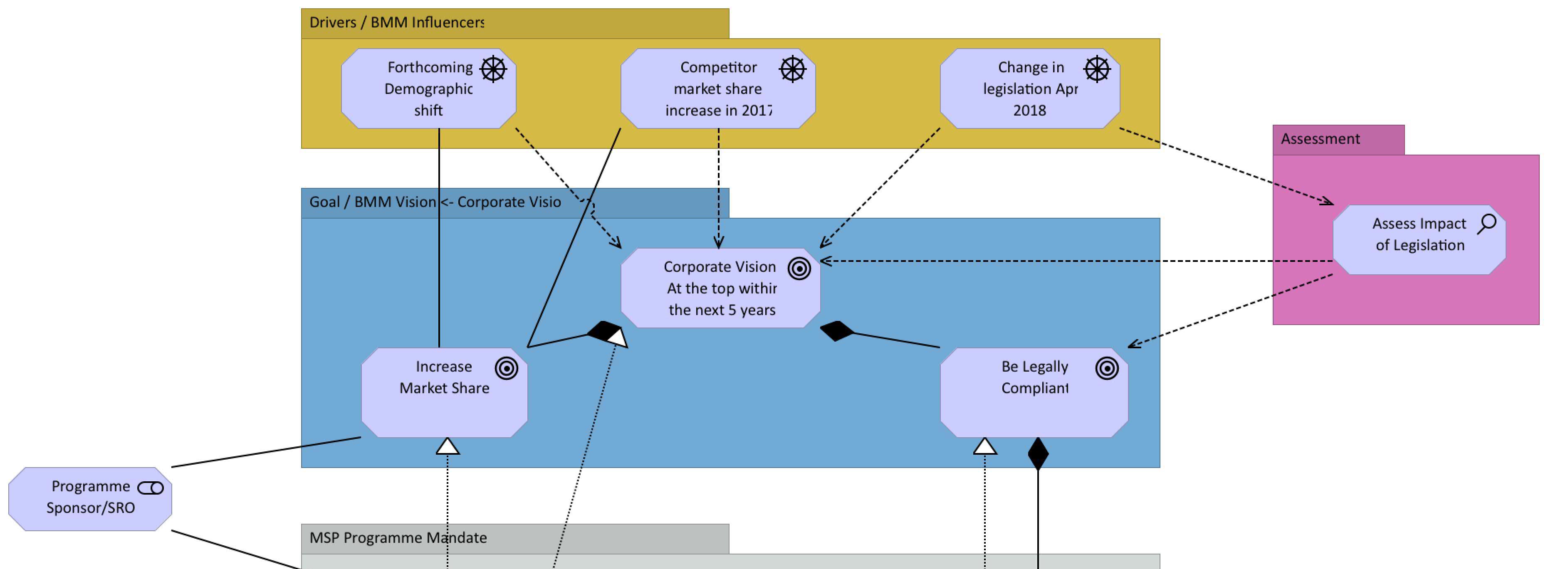 I set out to see how Business Motivation Model and MSP could be modelled using Archimate. It’s common to see the use enterprise architecture tools focus on the current state or a future state, but without easily assisting with the navigation from one state to the other, especially regarding what needs to be involved in change programmes.